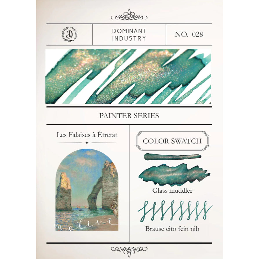 No. 28 Les Falaises à Étretat: a teal green ink that exhibits varying sheening blues and greens at high saturation alongside a burgundy-bronze shimmer inspired by Monet's paintings of Étretat, a coastal town in northern France in which Monet used color to capture the change of light throughout the day and during different seasons.