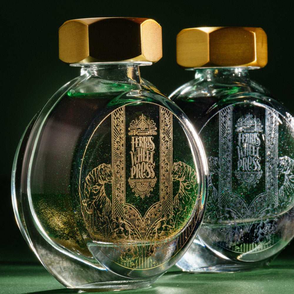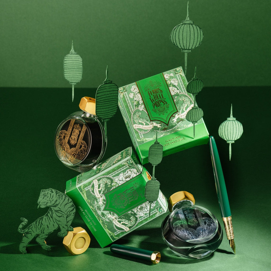 Presenting two distinct inks: Sunlit Jade, a warm lockwood green ink punctuated by a magnificent gold shimmer, and Moonlit Jade, which glistens in a starlight silver.