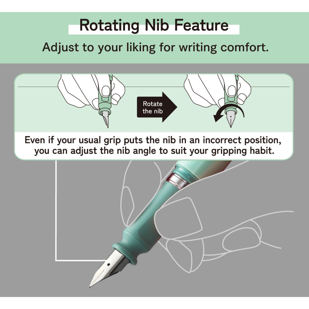 TUZU Adjust Fountain Pen equipped with Rotating Nib Feature, enabling nib angle/grip position changes. Fine angle adjustments at 10-degree pitches, so everyone can find their own comfort zone regardless of writing/gripping habits.