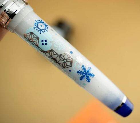 Designed in collaboration with PLUS Japan, this pen is inspired by the enchanting beauty of winter. Its translucent white and blue body is infused with silver glitter and decorated with silver and blue snowflakes. Snowflakes even adorn the nib and the cap finial! The pen comes in a gift box with a bottle of matching limited-edition ink and an extra converter.